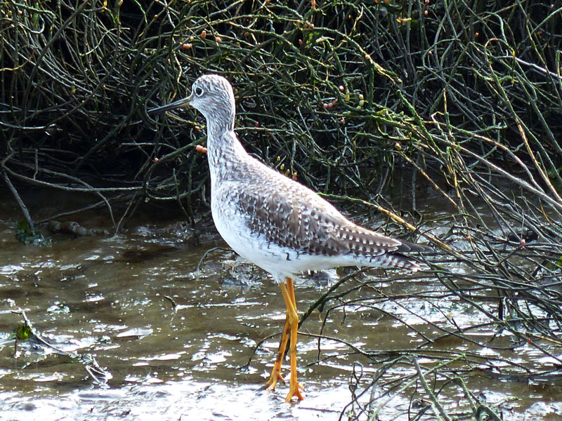 The greater yellowlegs breeds on the tundra and marshy areas. During migration and in the winter, it is found on lakeshores and tidal mudflats.