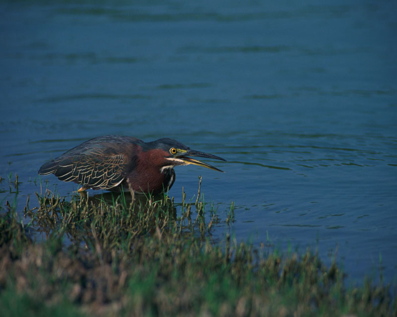 The green heron feeds at the edge of the water. It eats mostly small fish, but it also eats crustaceans, mollusks, insects, reptiles, amphibians, spiders, and leeches.