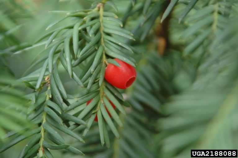 The yew tree is a conifer that has its seed in a cup! The seed of the yew is in a red berry-like cup called an aril. The yew has long, straight, flat needles. The seeds of the yew can be toxic. Some birds eat the aril and leave the seed. The wood of the English yew was once used to make longbows! |