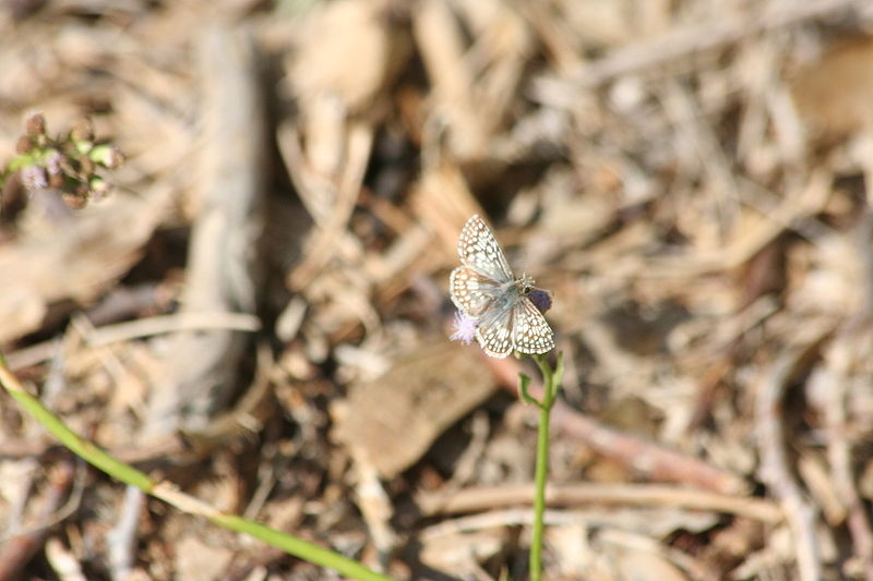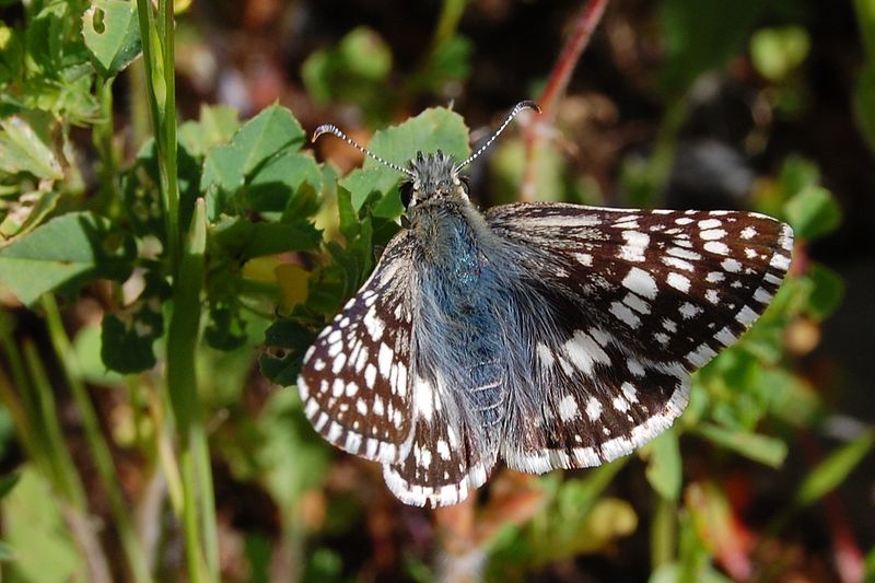 The two-banded checkered-skipper is found in the mountains from British Columbia and Alberta to southern California, Arizona, and New Mexico