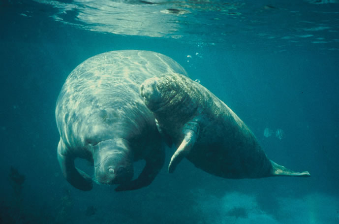 The West Indian manatee is an endangered aquatic mammal that lives in rivers, estuaries, canals, and saltwater bays.