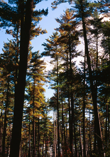 Logging has destroyed most of the original white pine forests, but the species is aggressive in reproducing itself and is found throughout its original range. The white pine is also grown on tree farms and plantations. The tree has a soft wood and is often used for pulp and to make furniture, crates, paneling, match sticks, and boats. White pine is also cultivated for Christmas trees.