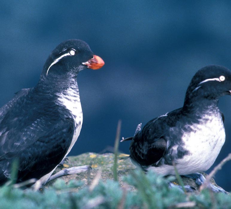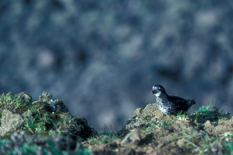 Least AukletThe least auklet leaves the open ocean in June to return to its breeding grounds. Least auklets gather in large colonies on boulder-covered beaches and on scattered locations on cliff faces. The female least auklet lays just one egg in a crevice. The egg hatches in about a month. The least auklet carries food for its chick back to the colony in a special throat pouch. The chick fledges in a month.