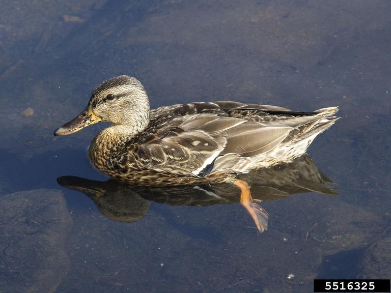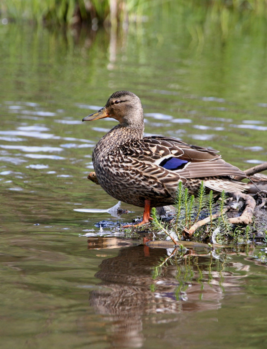 The mallard is about 20-28 inches in length and has a wingspan of about three feet. It has a blue patch on the top side of its wings with a white line around it. The female mallard is mottled brown and tan with a white tail and an orange bill.