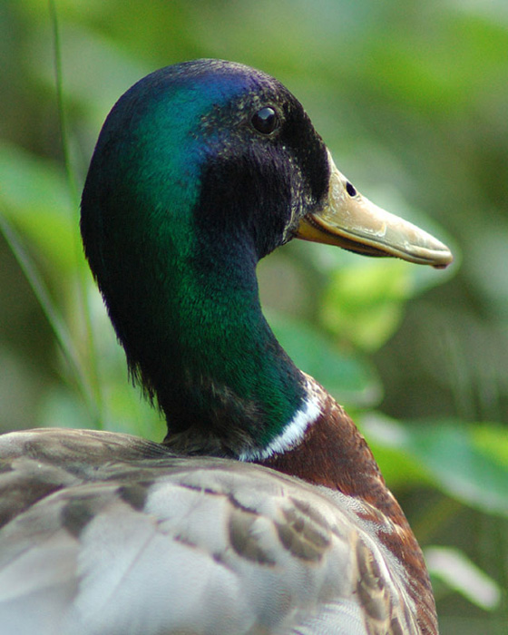The male mallard has a green head and neck with a white ring at the bottom of its neck. It has a brown chest, whitish-gray undersides, brown wings, and a yellow bill.