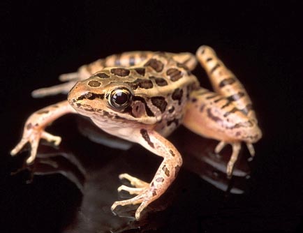 The southern leopard frog, Lithobates sphenocephala, is similar in appearance to its northern cousin and is found in the southeastern United States. It has smaller spots and its head is more pointed. |