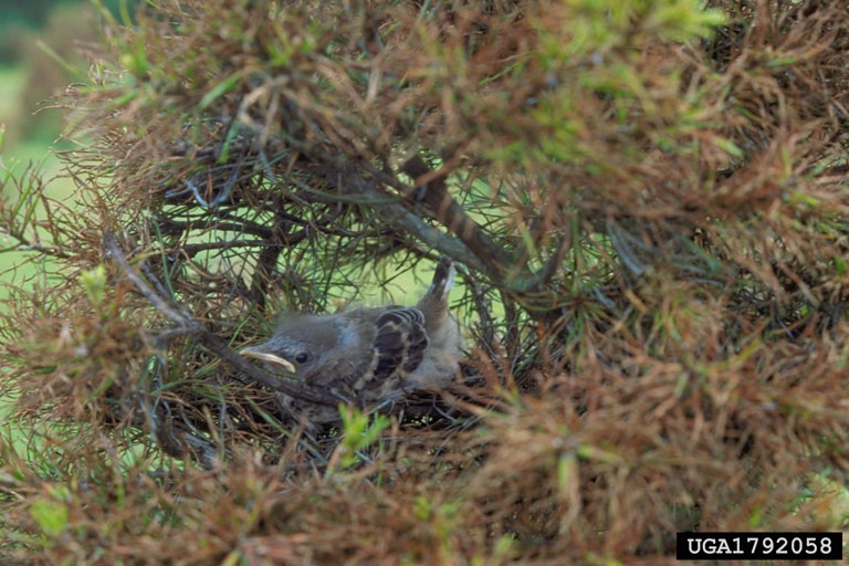 Mating season is between March and August. During mating season, male mockingbirds may sing in the day and the night! Mockingbirds build cup-shaped nests in the forks of trees or bushes. Both the male and female build the nest using twigs, leaves, and grass. The female lays between three to five eggs and incubates them. It takes about two weeks for the eggs to hatch. Both the female and male take care of the fledglings. The chicks leave the nest in a little over 10 days. The female usually has two broods a year, but she can have up to four.