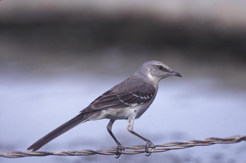 The mockingbird is gray on top and white on its underside. It has white patches on its wings that look like bars; a long black tail with white outer feathers; and a long, slender bill. Males and females look alike.