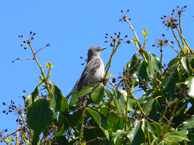 The northern mockingbird eats ants, beetles, grasshoppers, seeds, and berries.
