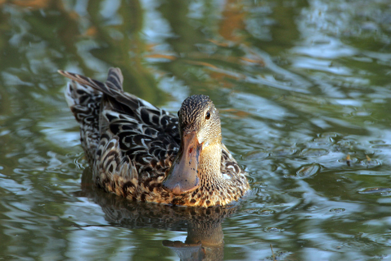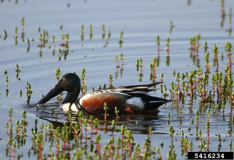 The northern shoveler is a filter feeder. It skims its bill just above the bottom of a pond or lake and sucks water into the front of its bill. It then uses the comb-like teeth on its bill to strain out plants and aquatic animals. It squirts the excess water out of the sides of its bill.