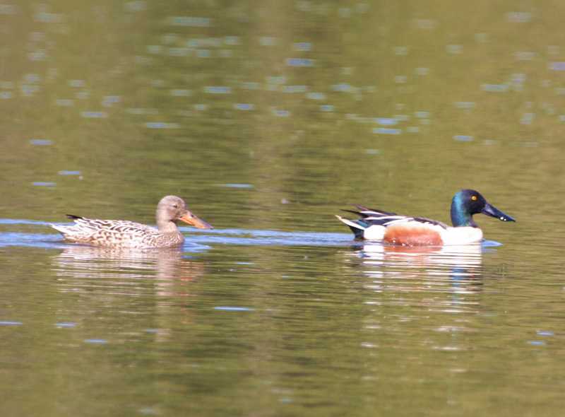 bill. During the breeding season, male shovelers have shiny green heads, a white body, rusty-red undersides,