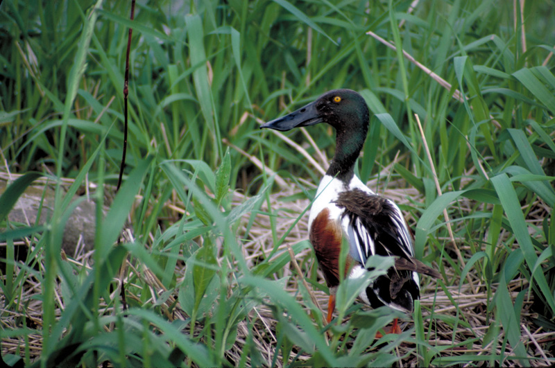 and black wings. In non-breeding season their color is a little duller and their head and breast are brown. Male shovelers have yellow eyes and a black bill.
