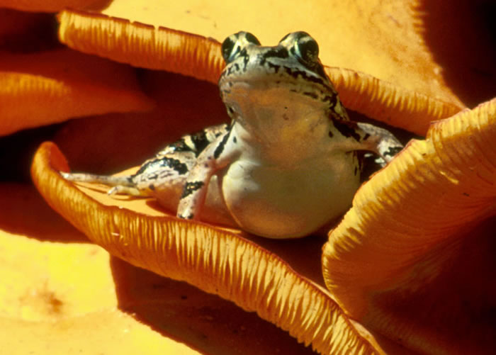The pickerel frog is sometimes confused with the northern leopard frog. The northern leopard frog looks similar, but its spots are round and randomly scattered on its body, and it doesn't have patches of bright yellow or orange skin on the inside of its thighs. Range |