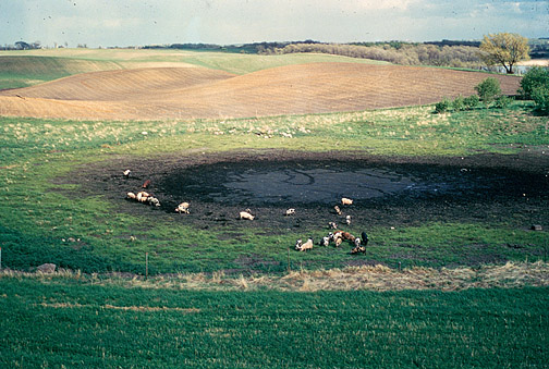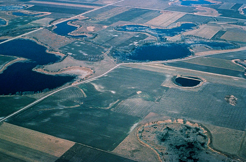 Today, these depressions fill up with water when it rains and when the snow melts. Since most of these depressions are in the prairies and they're often round like a pot, they are called prairie potholes. Some of them are temporary; others are permanent, depending on their size and amount of rainfall. |