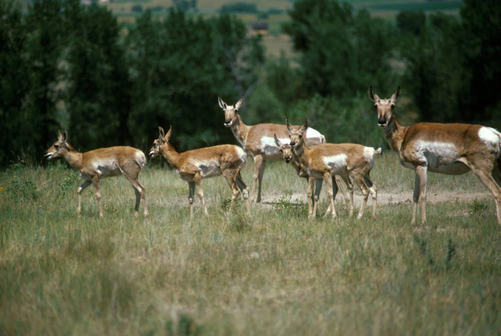 The pronghorn lives in grasslands, brushlands, and deserts. The pronghorn lives in herds that change in size depending on the season. In the summer, females and their young will gather in bands of less than a dozen individuals. Young males less than two years old form bachelor herds. Breeding males establish individual territories. In the winter, the herd will include males and females and can include hundreds of pronghorns. The pronghorn migrates from a summer feeding ground to a winter feeding ground.