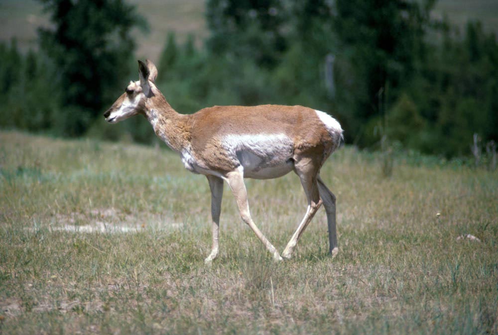The female does not have the black markings and her horns are usually straight, short spikes between 3-4 inches long. The pronghorn has horns, not antlers. Its horns are made of two parts: a bony core and a sheath-like covering made of a stiff hair-like material. It is the only animal that has branched horns, and it is the only animal that sheds its horns each year. The outer sheath falls off every year in the fall and then grows back in the summer.