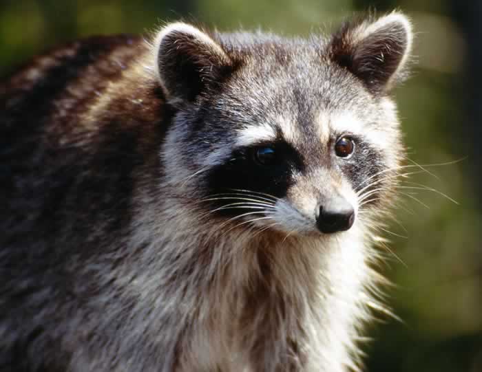 The raccoon has gray to brown fur. It has a black mask around its eyes with white fur around the mask. It has a stripe that runs from its forehead to its nose and white fur around its nose. It has a bushy, ringed tail and black paws with five toes. The raccoon's paws look a little like human hands. The raccoon's toes are flexible and it is very good at grabbing, pulling things apart, and holding things. The raccoon is a very good climber and can go down a tree backwards or face first! The raccoon is one of only three species of the Procyonidae family found in the United States. The other species are the ringtail and the white-nosed coati.