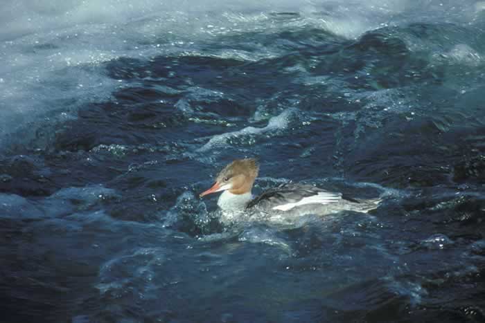 The red-breasted merganser breeds on the tundra in freshwater and brackish wetlands and protected bays. It winters on coastal bays, estuaries, and protected coastal areas. DietThe red-breasted merganser dives and uses its serrated bill to catch and hold fish, crustaceans, and tadpoles. It brings its prey back to the surface and eats it! Sometimes small groups of red-breasted mergansers will work together to herd fish into shallow water. Life Cycle Behavior