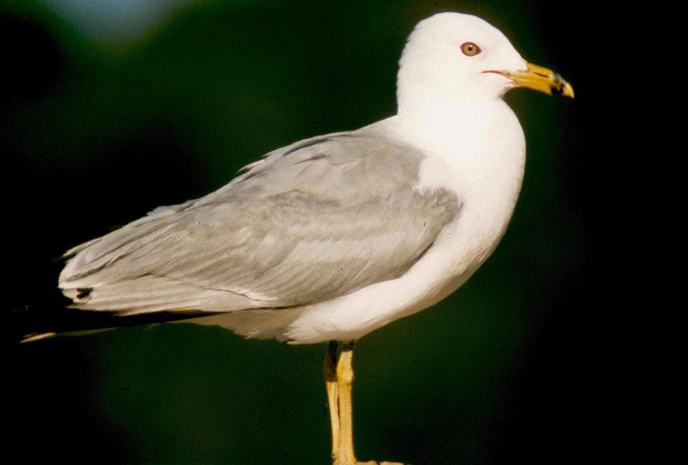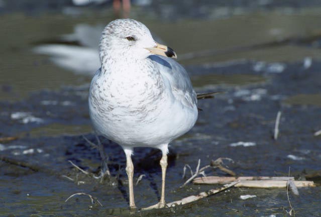 The ring-billed gull is a medium-sized gull. It is about 16 inches in length and has a wingspan of about 4 feet. It has a short, bright yellow bill with a black ring at the tip. It has a white head, neck, chest, and belly and a soft gray back and upperwings.