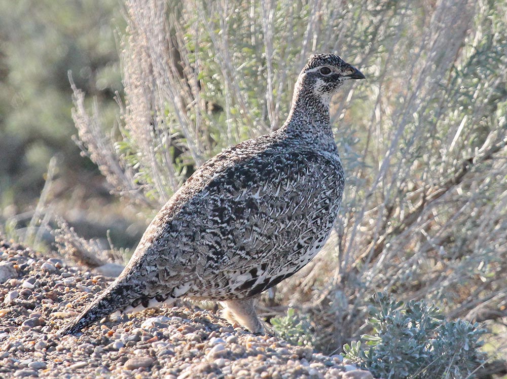 The greater sage grouse is the largest North American grouse species. They are 19-30 inches in length and two feet tall. Males are larger than females. Both the male and female greater sage grouse are brownish-gray with gray and white speckles. They have a black belly, a yellow comb over their eyes, and a long tail with stiff pointed feathers.