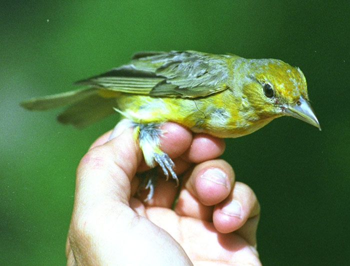 yellow underparts, and a brownish-gray tail edged in green.