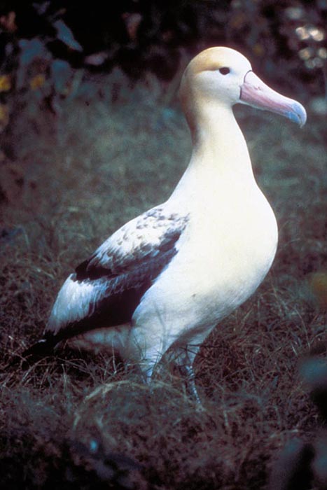 The short-tailed albatross is a large seabird, 33-36 inches in lenght, with a 7 foot wingspan. It has light yellowish-brown feathers on its head and the back of its neck and a white chest and belly. It has black and white wings, yellow feet, and a large pink bill with a blue tip. Juvinile short-tail albatrosses are brown. Despite its name, the tail of the short-tailed albatross is not shorter than the tails of other albatross species.