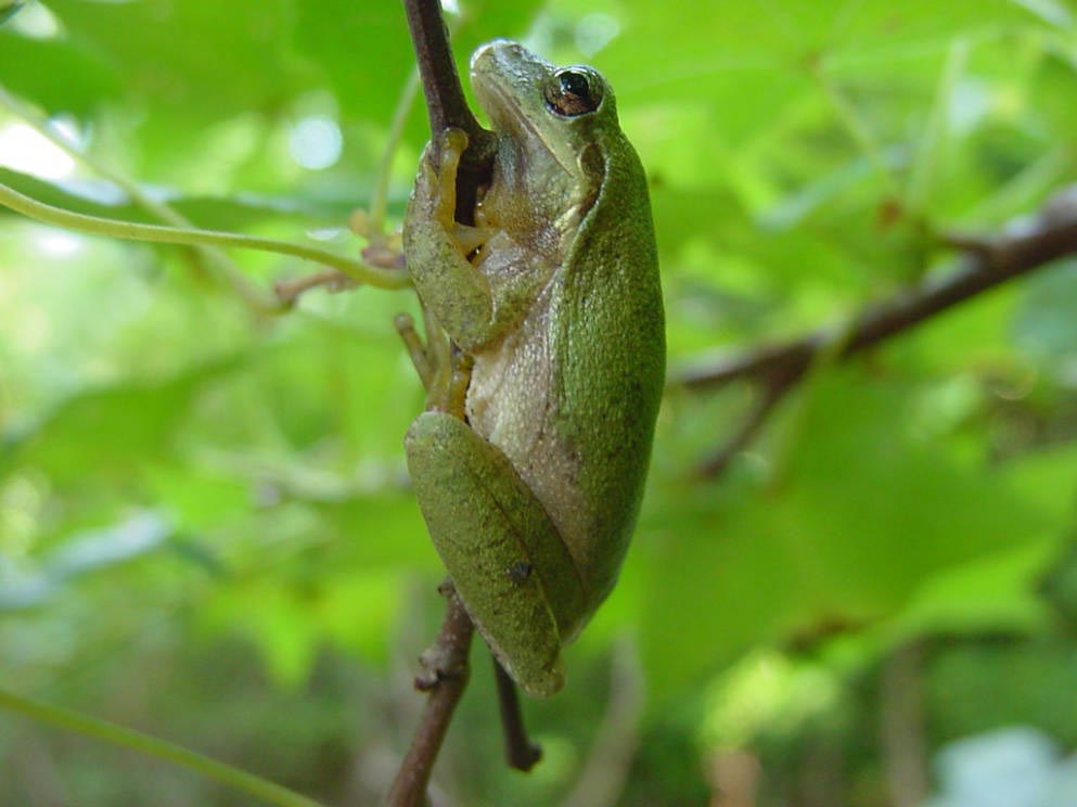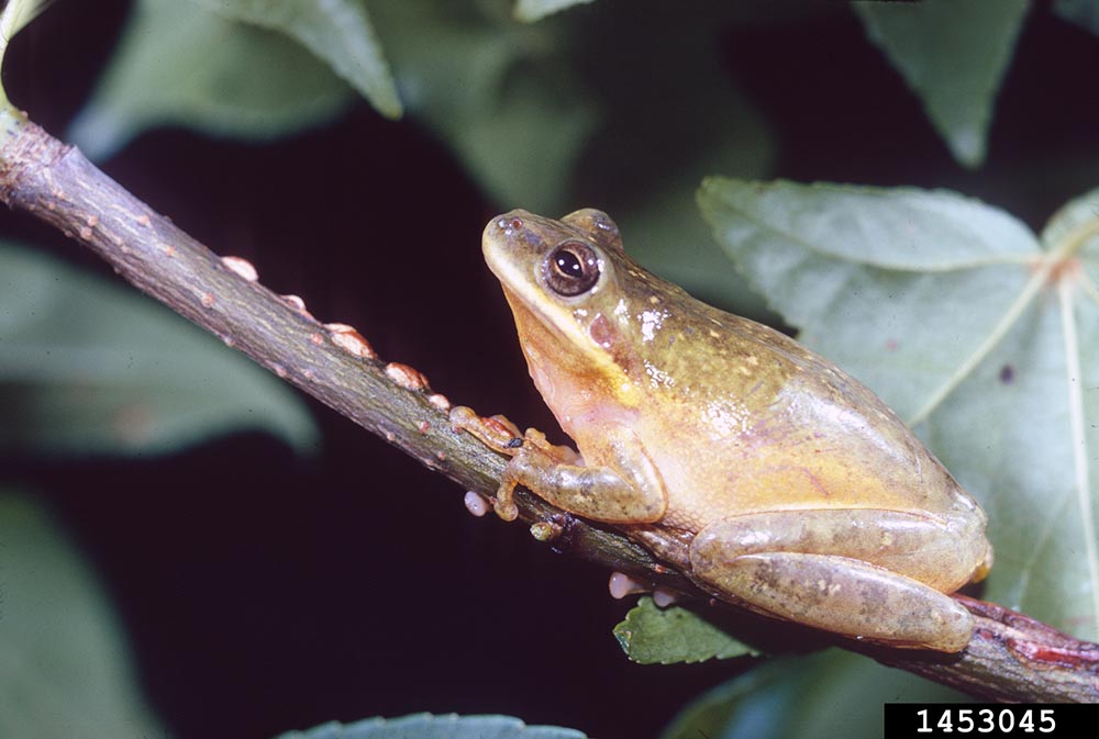 The squirrel treefrog can vary in color from brown to yellow-green to green. It is 1-1½ inches in length. It may have a light stripe running from under its eye along its jaw. It may also have a dark mark between its eyes, and it may have dark spots on its body. It has large toe pads that help it cling to trees. The squirrel treefrog gets its names from its squirrel-like call.
