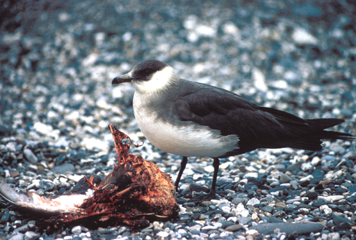 Stercorariidae - skuas, jaegers Skuas and jaegers are gray or brown with white markings on their wings. They have long bills with a hooked tip and large webbed feet with claws. Skuas and jaegers are kleptoparasitic birds. That means they get their food by stealing it from other animals. A large part of their diet, up to 95%, is made up food they steal from other seabirds like gulls and terns. Skuas and jaegers harass and chase other birds in the air and force them to drop whatever it is they are carrying. Some species also chase birds on the ground to steal their food. Once the other bird has dropped its catch, the skua or jaeger will swoop down and catch the food before it hits the water or the ground. When they are on their breeding grounds they also prey on eggs, chicks, and lemmings. World Status Key US Status Key