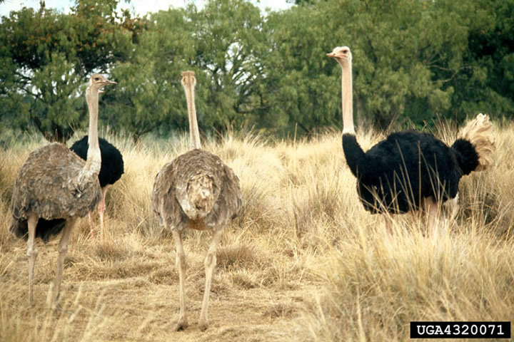 The ostrich is the world's largest living bird. It is up to 8 feet tall and weighs as much as 280 pounds. Ostriches have long necks; small heads; and long, powerful legs with two toes. Ostriches can not fly, but they can run at speeds of up to 40 miles per hour. They use their wings to help them keep their balance when they are running. Ostriches use their speed to escape from predators. They also use their powerful legs to kick predators. Males have soft, shaggy black feathers; females have soft, shaggy grayish-brown feathers. Ostriches live in groups of up to 100 individuals, although most groups have around 10 birds. Males mate with 3-5 females, including one dominant female. All of the females lay their large eggs in a group nest. The nest is a scrape on the ground. The male incubates the eggs at night and the dominant female incubates the eggs during the day. A single nest may have as many as 25 eggs. The eggs hatch in around 25 days. The male and the dominant female care for the chicks and protect them from predators. The chick leave their parents when they are about a year old. Ostriches are nomadic and wander for place to place in search of food like leaves, seeds, grasses, roots, insects, and small reptiles and amphibians. World Status Key US Status Key