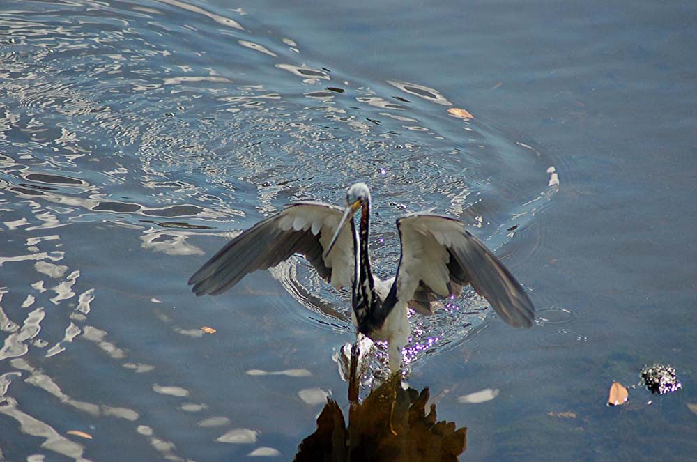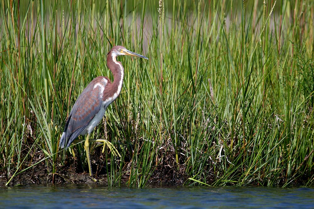 The tricolored heron is found in marshes, swamps, bayous, mudflats, lagoons, and coastal ponds.