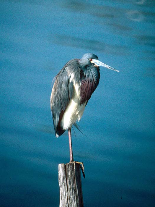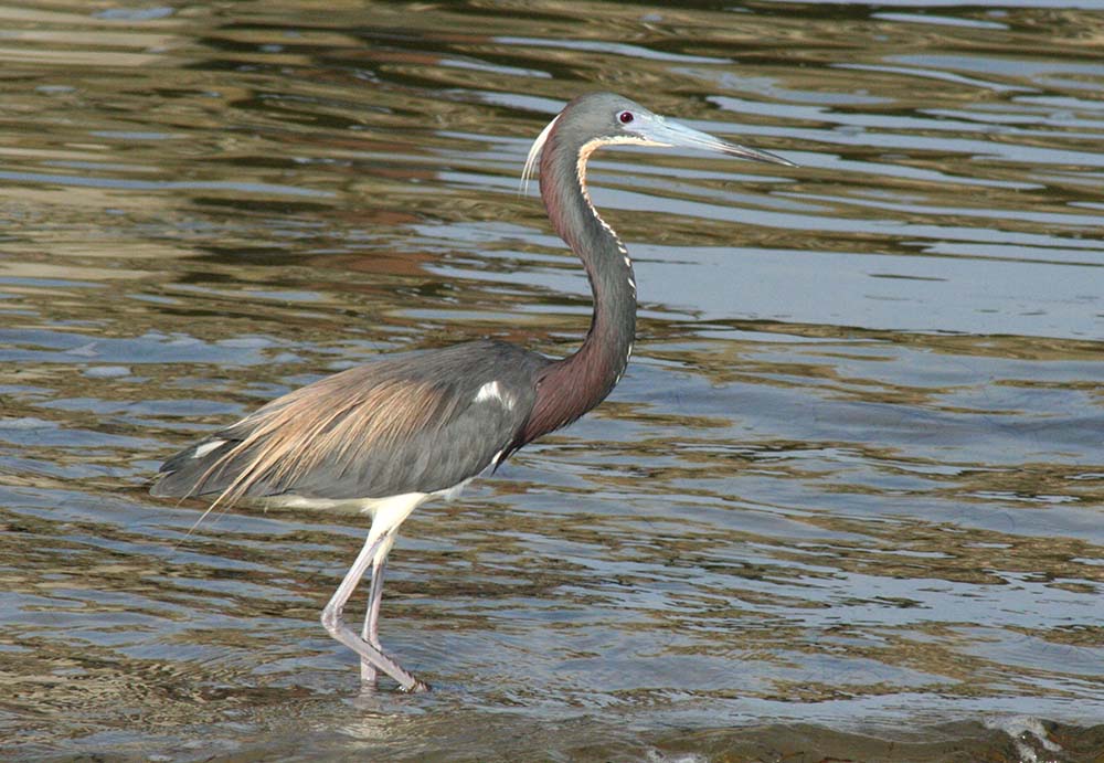 The tricolored heron is about 22 inches in length and has a wingspan of about 3 feet. It has slate blue feathers on most of its body, except for a white chest and belly and a rust-colored neck. It has long yellow legs; a white stripe that runs up its neck; and a long, pointed yellow bill that turns blue during breeding season. Males and females look alike.