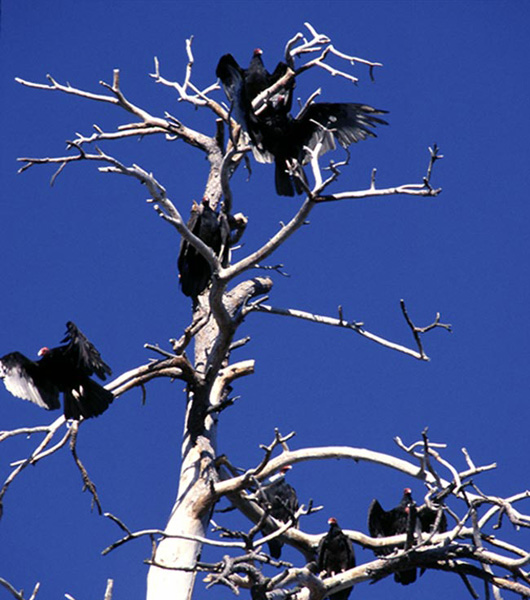 The turkey vulture is a scavenger. It only eats carrion. It soars over the land looking for dead animals. It flies at low altitudes with its wings in a V-shaped angle called a dihedral. As it flies, it rocks from side-to-side instead of flapping its wings. This saves energy and allows the turkey vulture to stay in the air longer. It also glides on thermals or updrafts of air.