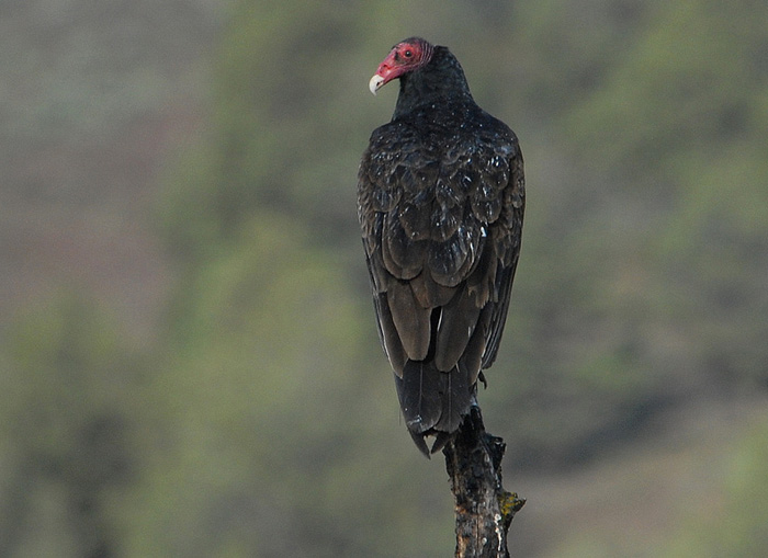 5-6 feet. It has a blackish-brown body; a long, rounded tail; and a featherless, wrinkled, small red head. It has short thick legs; weak feet; and a relatively weak, short hooked bill. Males and females look alike, but the female is slightly larger. Range The turkey vulture breeds from southern Canada south though most of the United States. It winters in the Southwest and from southern New England south to Florida.
