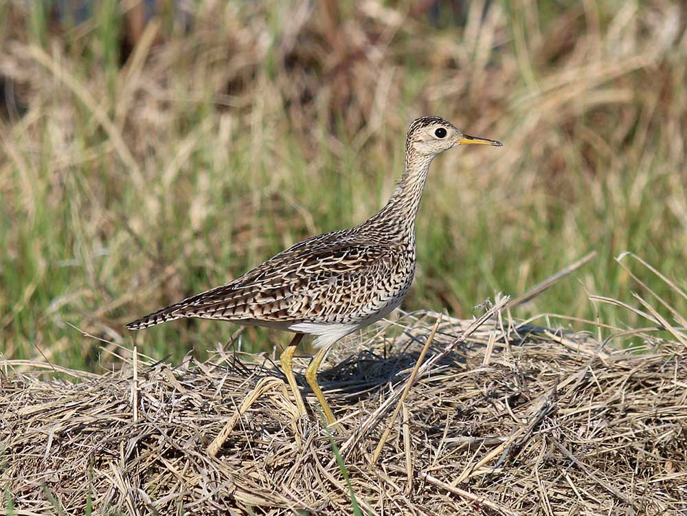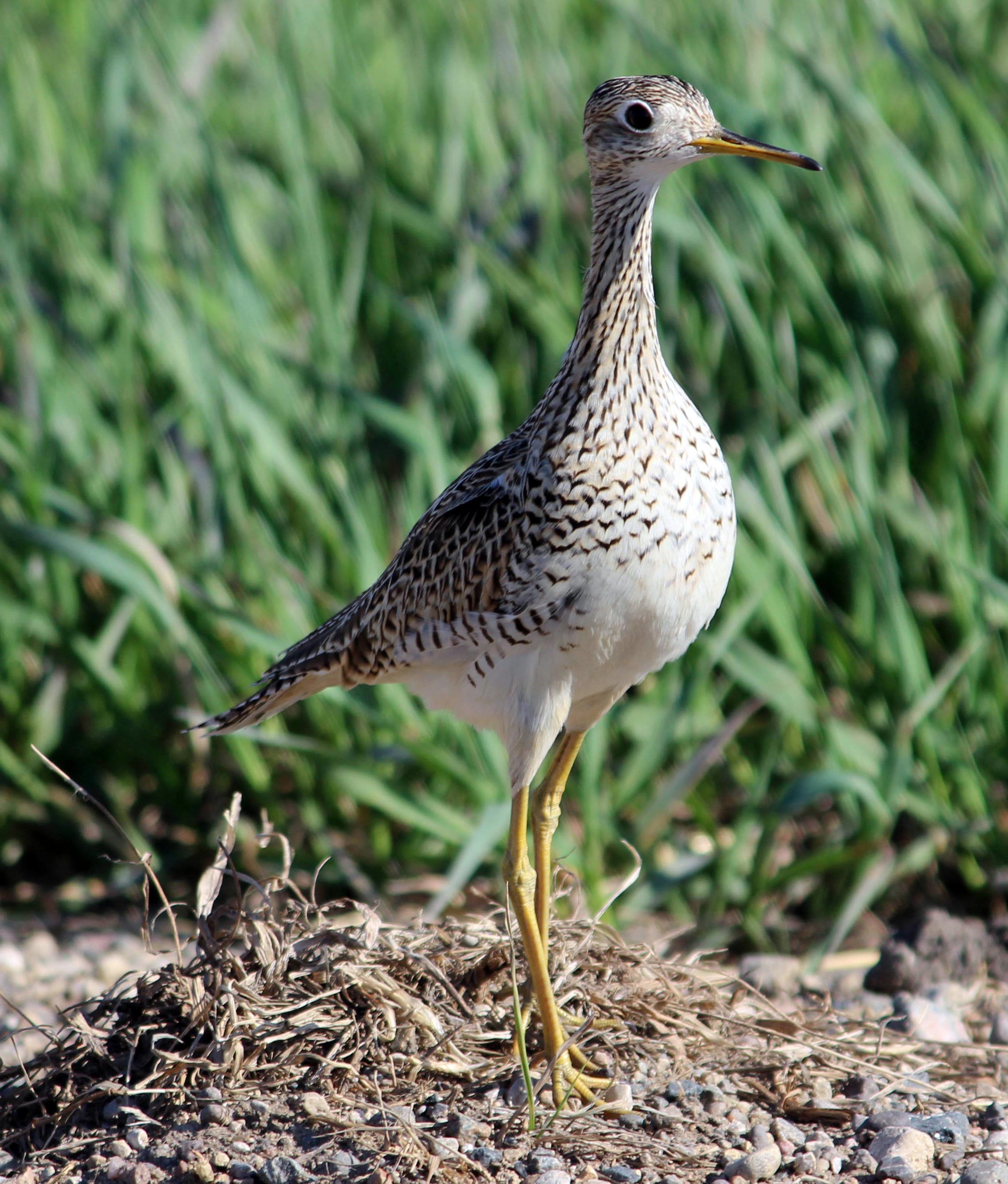 The upland sandpiper is 11-12 inches in length. It has long, yellow legs; long wings; large eyes; a sharp, pointed, black-tipped yellow bill; a small head; and a long neck.