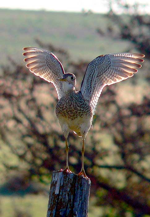 Behavior The upland sandpiper often perches on fence posts, stumps, or telephone poles. When frightened, it runs a short distance and then freezes in an attempt to blend into its background.