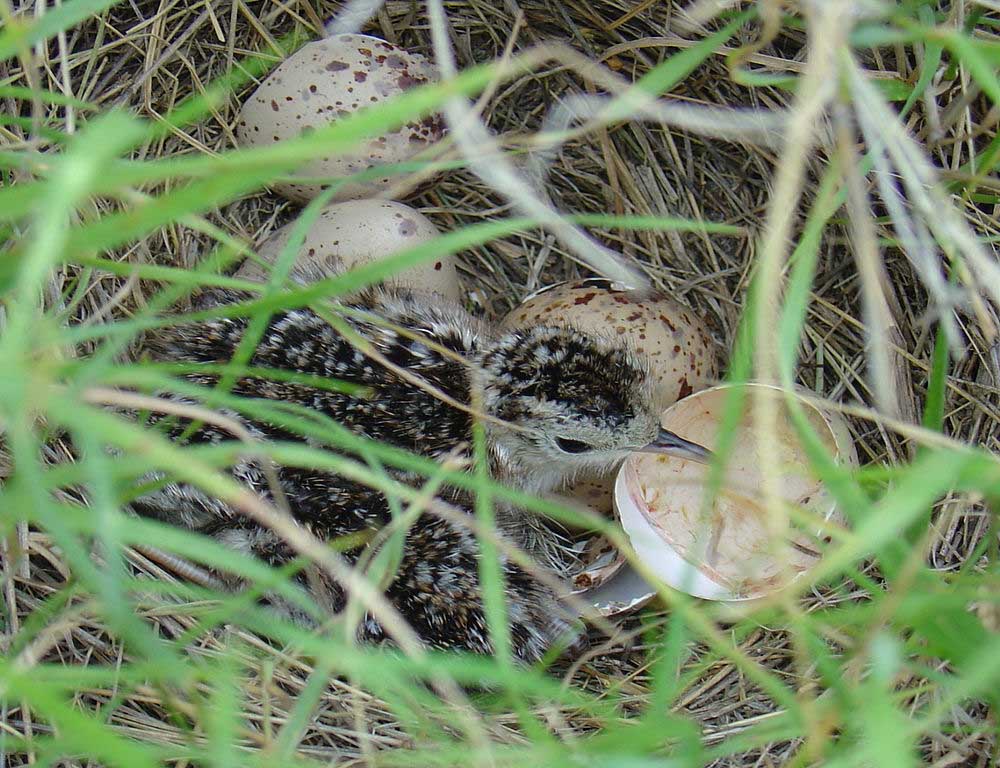 Both the male and female create a nesting spot by scraping out a depression in the ground. The nest is made under a bush or in a clump of grass. Sometimes grass is pulled down over the nest to help hide it. The female lays 4 eggs, and both the male and the female incubate the eggs. The chicks hatch in 21-27 days and fledge in about a month. The chicks are precocial and start hunting insects shortly after birth.