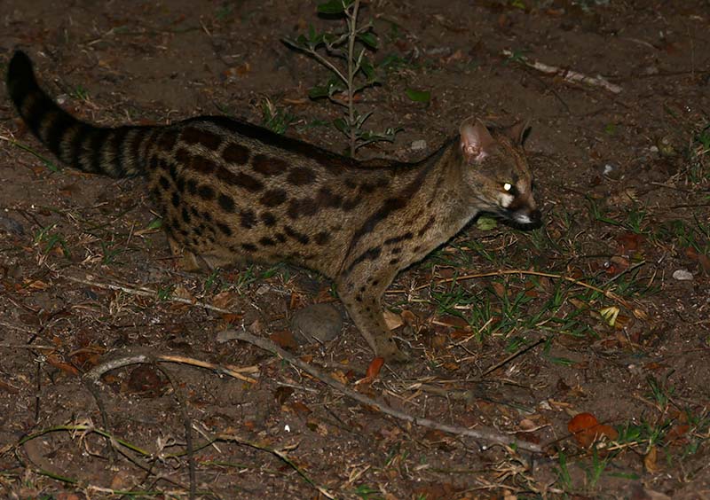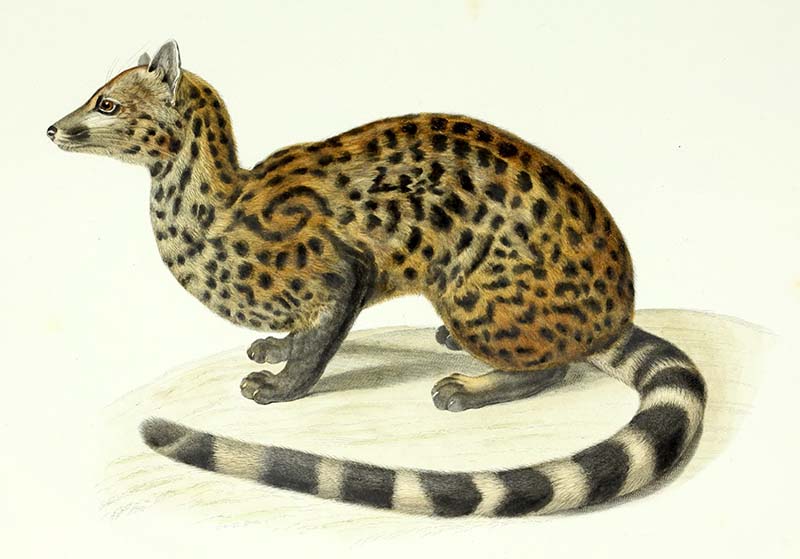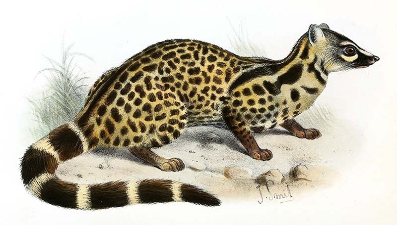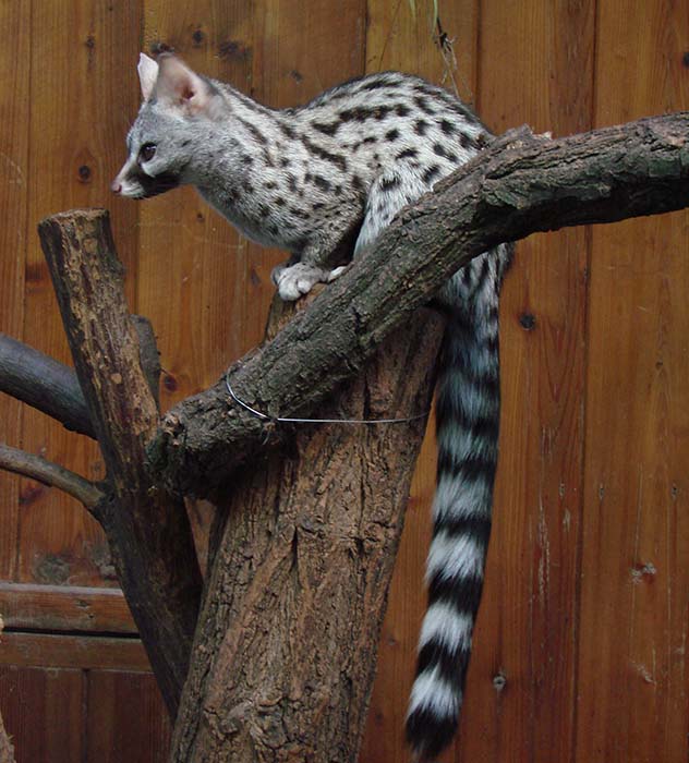 The common genet is a long, slender cat-like carnivore with a very long tail.