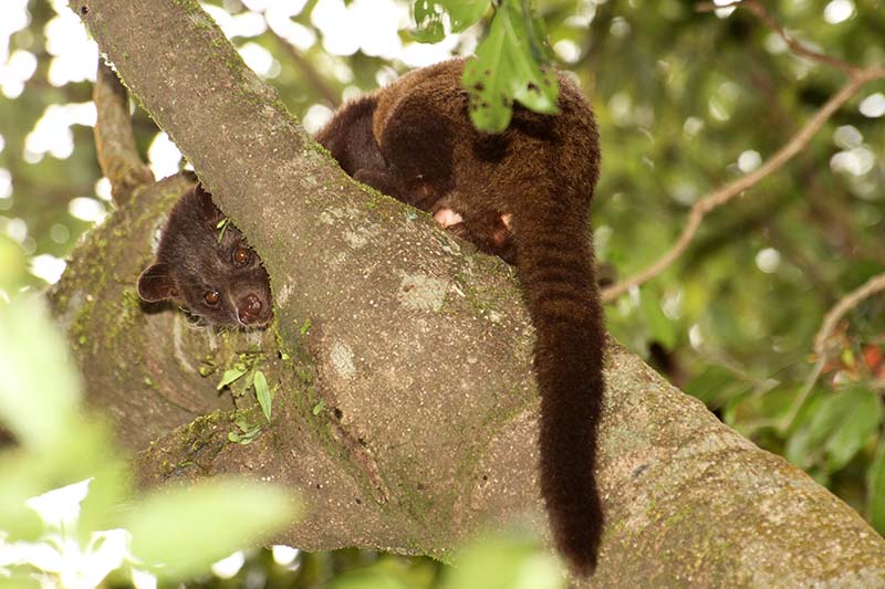 The golden palm civet is mostly arboreal, although it will sometimes forage on the forest floor for food.