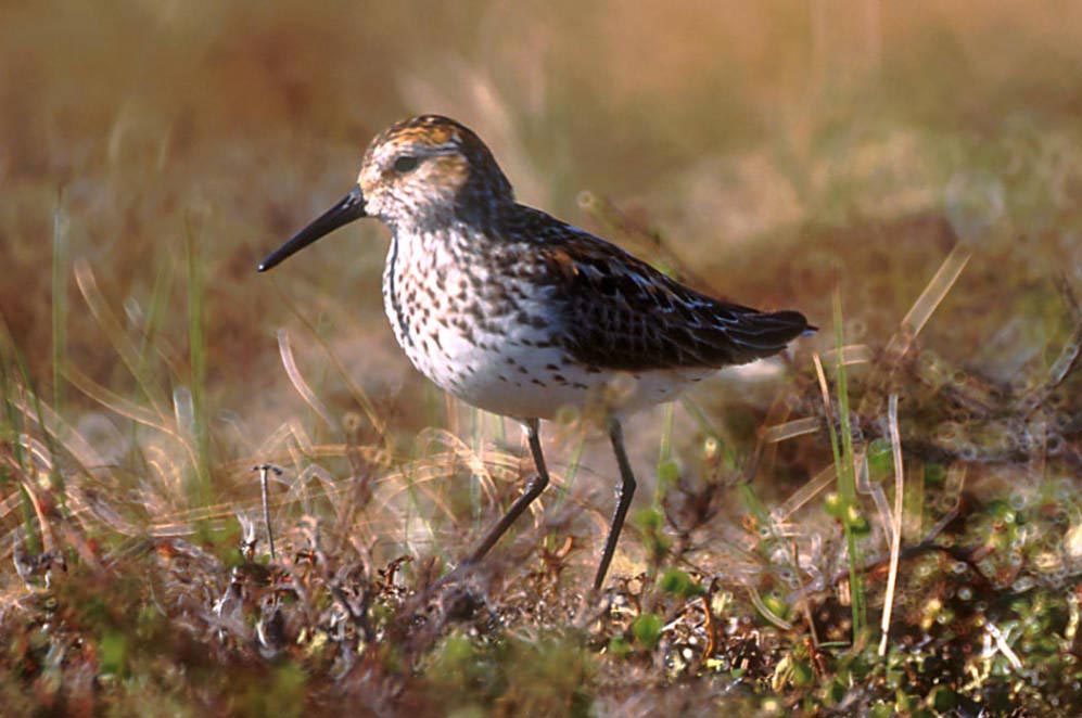 The western sandpiper is very similar in appearance to the semipalmated sandpiper. It is 6-7 inches in length and has a wingspan of 10-15 inches. It has white undersides, a long bill with a little droop at the end, long legs, and slightly webbed feet. In the summer, its crown and upper back are a rusty brown. It has a black line on its rump that runs to its tail. In the winter, its crown and upper back are gray. Males and females look alike, but the female is a little larger and has a slightly longer bill.