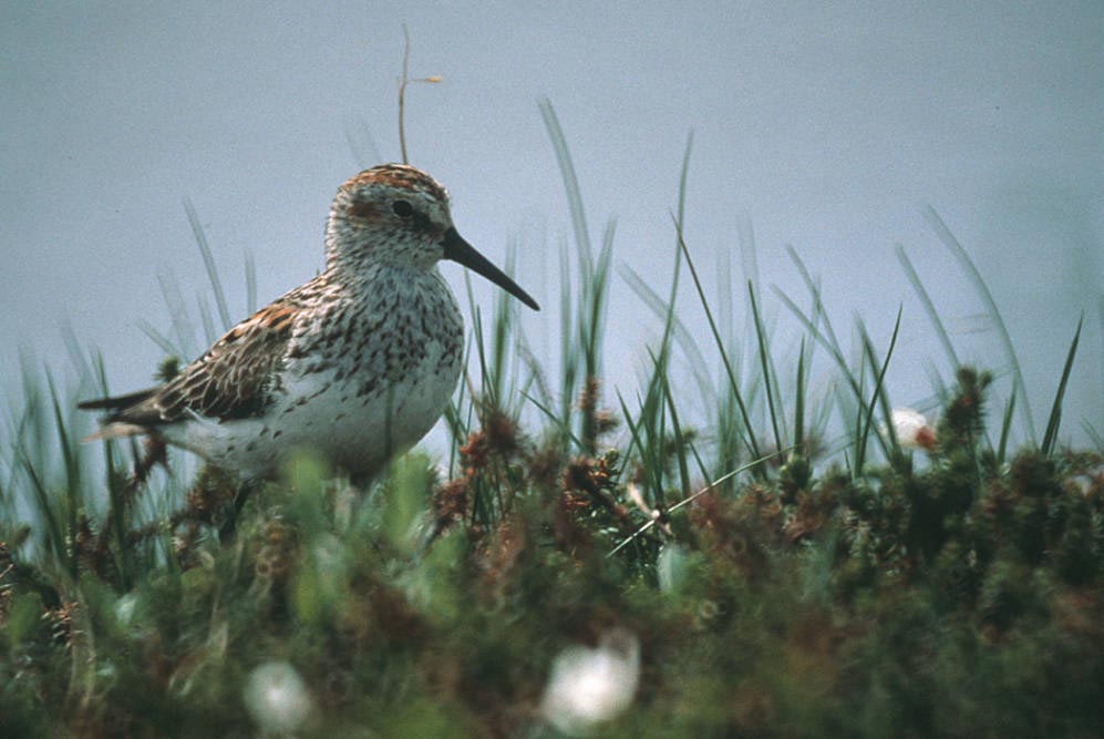 The male sings and flies over the nesting territory to attract a mate. He also may approach a female in a crouched position and make a trilling call. The male makes several scrapes in the ground and lines them with sedges, lichen, and leaves. The female chooses one of the scrapes as her nesting site. The female western sandpiper lays 3-5 eggs. Both the male and the female incubate the eggs. The female may leave before the eggs hatch, and the male will take over incubating the eggs. The chicks hatch in 20-22 days and can feed themselves right after hatching. If the female stays, both parents care for the chicks. If she leaves shortly after the chicks hatch, the male will care for the chicks. The chicks fledge when they are 19-21 days old.