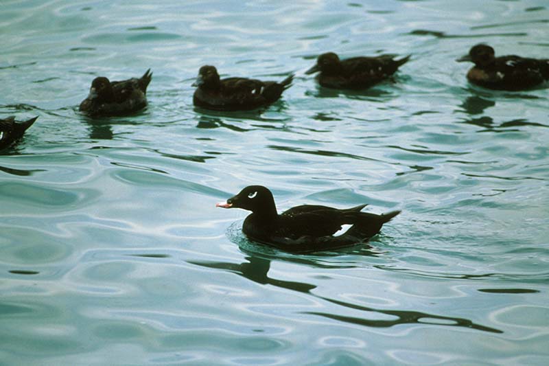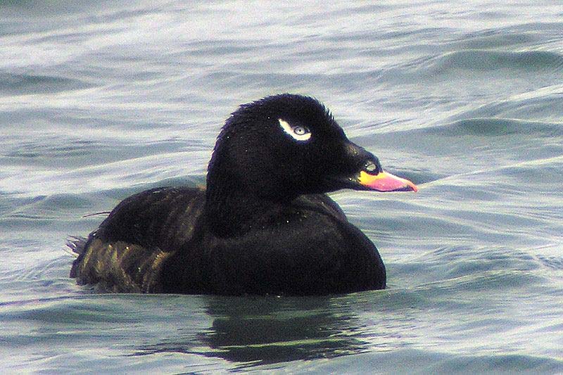 AvocetWhite-winged scoters are large and stocky birds, measuring about 21 inches in length. They are among the largest of all ducks. Males are all black, with a white, comma-shaped patch around each eye. Females may have whitish patches on the face and are a dark brown color. The male's bill is black at the base with reddish sides and an orange nail. The female's bill is similar in color but less bright. Both males and females have red legs and a white stripe on their wings.