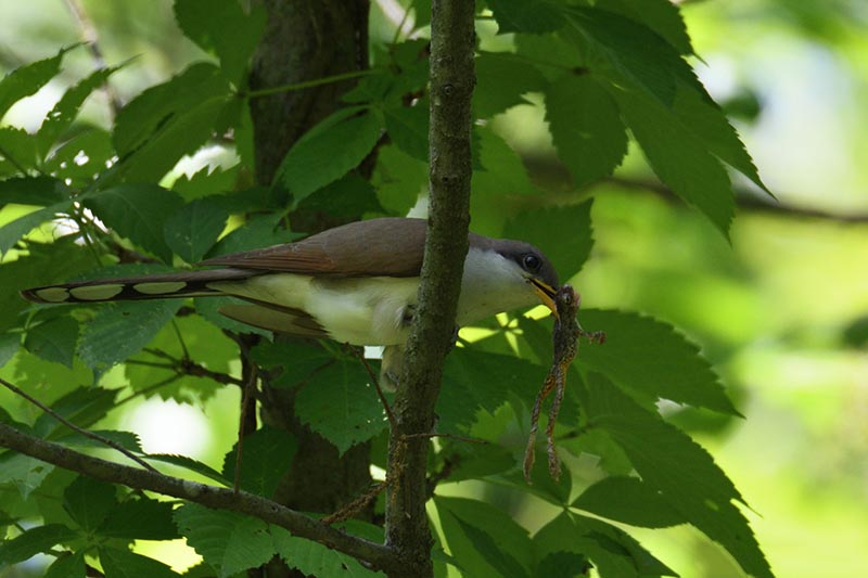 The underside of its tail is dark brown and has two rows of large white spots. It has a down-curved bill that is black on the top and yellow on the bottom and a ring of gray skin around its eyes. It is grayish-brown on its head and back and has a rusty-red patch on its wings. It has a dull white breast and belly. Males and females look alike, but females are a little larger. Range | HabitatThe yellow-billed cuckoo is found in open woodlands and forested streams with dense, low vegetation. It is often found in orchards, overgrown pastures, abandoned agricultural fields, shrublands, and thickets. Diet